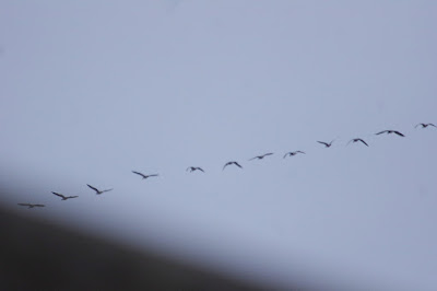 At the moment early mornings almost always bring the sight - and sound - of Pink-footed Geese flying north west over the house: the garden is full of Goldfinches, Blue Tits and Starlings.